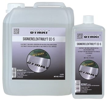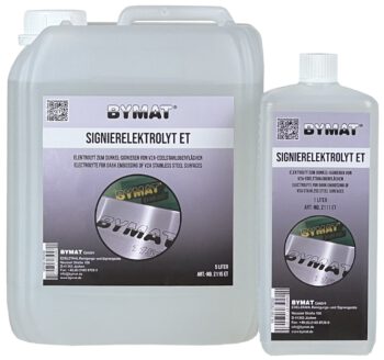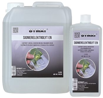 Elektrolyt zum Hell-Signieren von Edelstahloberflächen. Mithilfe einer Signierschablone erstellen Sie dauerhaft eigene Logos und Schriftzeichen auf Edelstahloberflächen.