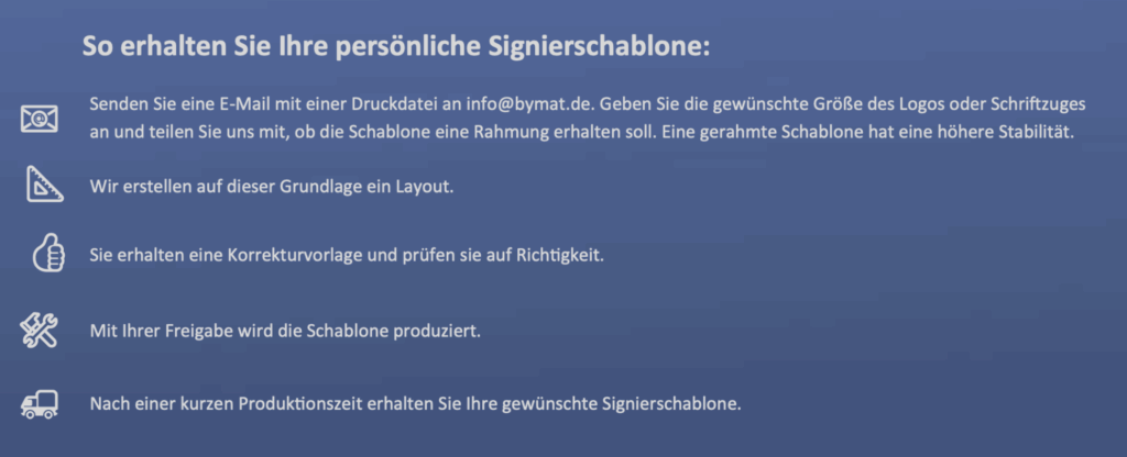 Mit einer Signierschablone von BYMAT erstellen Sie in Sekundenschnelle Wunsch-Logos und Schriftzeichen auf Edelstahloberflächen. Eine Schablonen kann bis zu 10.000 mal eingesetzt werden. Signierschablonen bieten wir in verschiedenen Größen an.